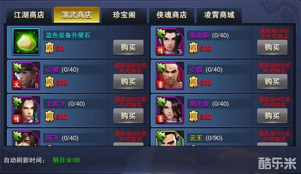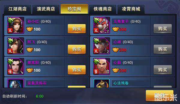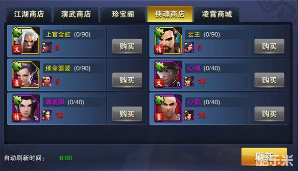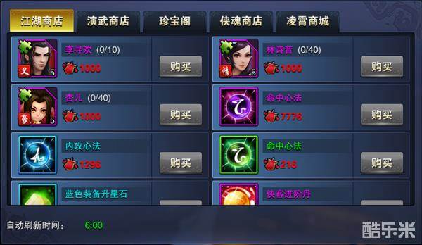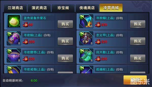 温馨提示:江湖商店和演武商店都是每天6点自动刷新的,珍宝阁、侠魂商店和凌霄商店每天6点自动刷新也可以花费小额元宝手动刷新哟。