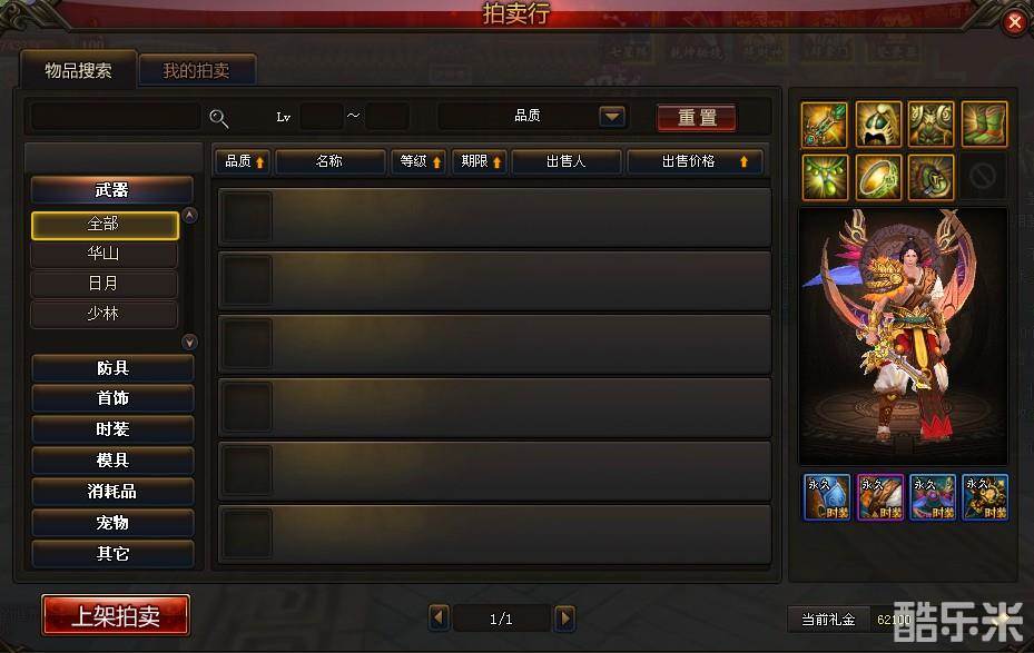 拍卖行界面如下,交易平台上琳琅满目,各类武器装备、时装、宠物、消耗品应有尽有,玩家可根据自己的需求选择购买相应的物品。