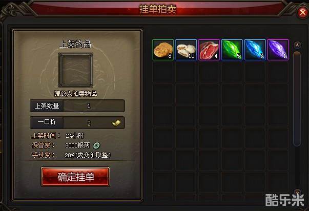 当然,有买就有卖,玩家只需打开“上架拍卖”按钮,即可进入挂单界面,如下图所示。挂单界面的背包栏之中,只显示未绑定物品,也就是说绑定物品不能进行寄售拍卖。设定好寄售物品的数量及价格之后,点“确定挂单”即可正式寄售(原则上一口价应高于竞拍价,寄售批量物品时,价格为每个物品的单价)。每位玩家最初都可以挂10单,VIP等级越高,挂单的数量也随之增加。