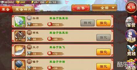 等级:装备的等级与主公等级挂钩,装备等级是主公等级的两倍,强化暴击时可能会超出一点点。Ps:装备经验不能传承,所以前期不要急着把那些破装备升满级,够用就行,遇到好装备再大量投钱吧。