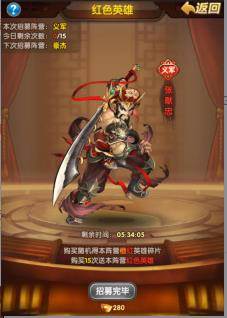 50级后会开放一个至尊招募,每一次招募需要280元宝。可以随机获得当天阵营的澄、红英雄碎片。购买15次后获得阵营红色英雄。每天都有一次机会哦。