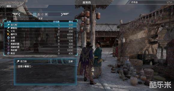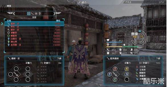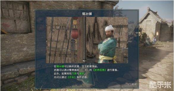 锻冶铺:可以进行武器、宝玉和装饰品的购买、出售和开发。开发需要有对应的竹简和素材。本作不再像前几代那样通过战场的特殊条件来获得秘武,武器通过购买和开发获取。终极武器的开发竹简需要在古币收藏家处用古币兑换。