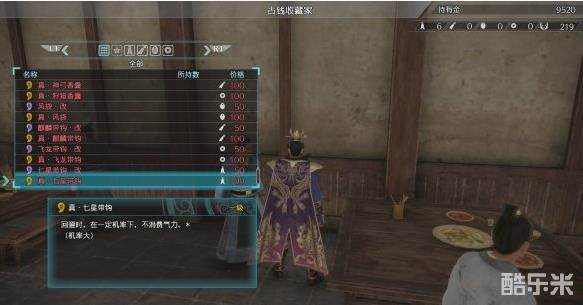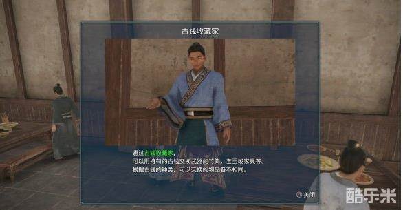 古币收藏家:可以用古币兑换武器的竹简、宝玉和家具等。游戏中现在分为布货,刀钱,蚁鼻钱,环钱四种古币,其中蚁鼻钱可以用来兑换终极武器的竹简。古币可以通过狩猎点数、主线战场、击杀野外的盗贼头目以及钓鱼等获取。