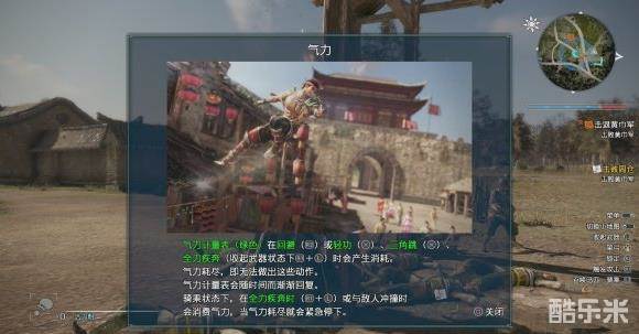 气力和回避系统:游戏中的绿色计量条就是气力,这个系统和“怪物猎人”、“黑暗之魂”等系列相似,人物进行加速奔跑、回避和轻功时都会消耗。在骑乘状态下加速奔跑和冲撞敌人也会消耗气力槽,气力槽消耗完后马匹会有抬起前脚的硬直动作,所以建议气力条尽量不要消耗完。