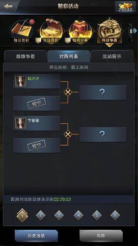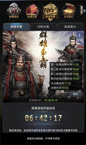 本周更新后,各位主公可以从“精彩活动”栏目中进入这次新增的活动——群雄争霸,本次活动以同服务器淘汰赛的模式进行,活动期间成功报名并在报名者中排名前1800名的玩家,会按照历史最高战力排行依次编入不同的组内进行淘汰对战,分组级别越高,等待各位主公的奖励将会越丰富!5月23号启动报名,5月24号即日开打,想要体验群雄争霸的主公们千万不要错过!