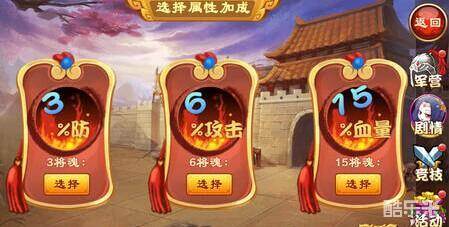 临时属性加成:每过3关可选择临时属性加成,需要消耗将魂数购买。分别随机加成3%、6%、15%、30%、45%、60%、75%中的攻防血智属性中的一种,各自消耗对应的将魂数。属性都按随机出现,一次只能选择一种加成。所有临时属性加成可以叠加,一直持续到该次挑战结束。