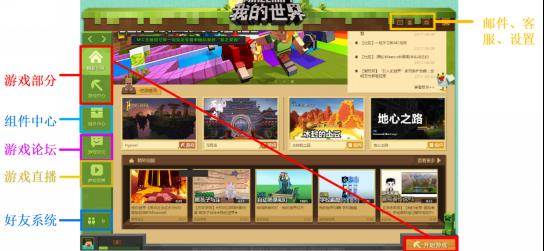 【我的世界启动器】的界面包含两大部分:主体内容区,辅助导航栏。当我们点击红色方框内的“开始游戏”和游戏中心,便可以直接进入《我的世界》;蓝色区域内则可以进入组件中心;粉色区域对应着游戏论坛;点击黄色区域,则可以观看游戏直播。好友系统中,玩家可以添加好友并互动;而在界面右上方的小型图标,则对应着邮件、客服和系统设置。