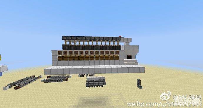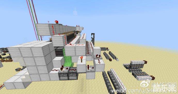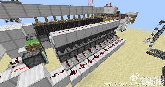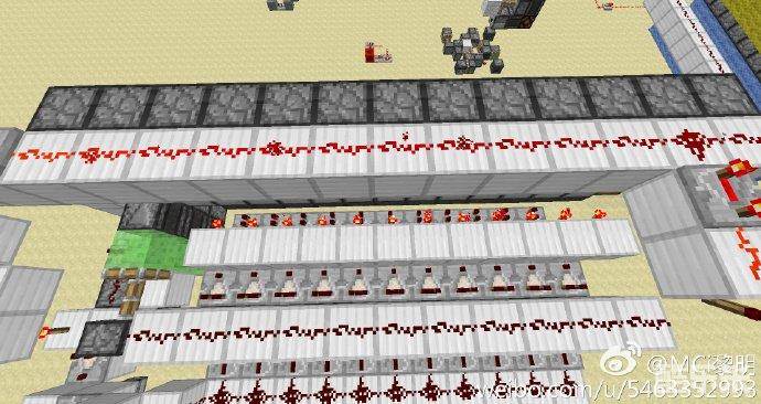 现在来讲一讲图左下角那个红石火把,当比较器检测到唱片的时候,左下红石火把熄灭,图上一排和左下粘性活塞会收回侦测器,又下火把亮起锁定铁块下方的漏斗,这时我们从唱片机里取出唱片,唱片会被漏斗吸到下方的投掷器里,同时红石火把亮起,激活图上一排和左下粘性活塞,完成瞬传,分类完成,这时右下火把经过延时后熄灭复原信号锁定,这时就可以放入下一张唱片了