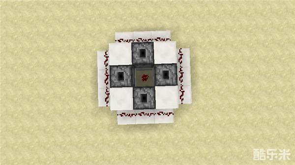 第二步:建造第二层,四个投掷器呈十字摆放,方向朝上,在第一层的红石中继器上方各放置一个方块。