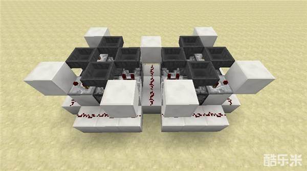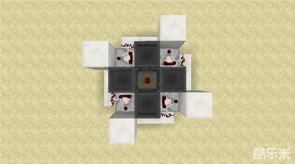 第三步:第三层,在每个投掷器上面放一个漏斗,四个角分别放一个红石比较器,红石比较器的输出端放一个完整方块,当红石比较器输出信号时,方块被充能从而激活其下方的红石线。这么一来,就实现了只要四个漏斗其中1个脉冲的信号强度为3,就会激活相邻的投掷器。这样便大大增加了其不确定性,也就增加了随机数产生的随机性。