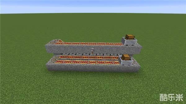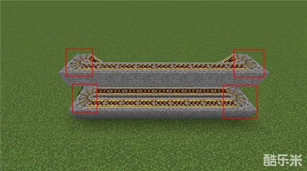 第六步:铺设铁轨,在拐角的位置放置普通铁轨,其他地方放置充能铁轨,最后让铁轨形成一个闭环。