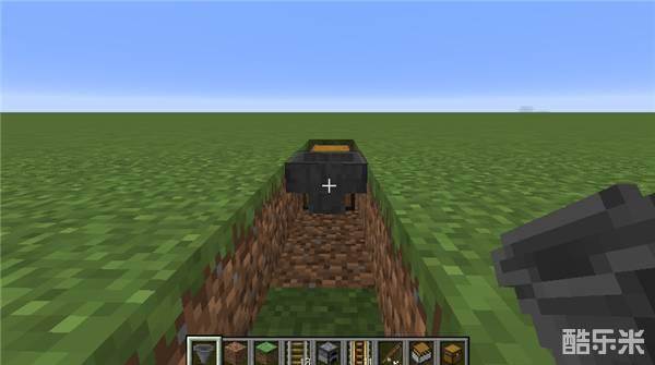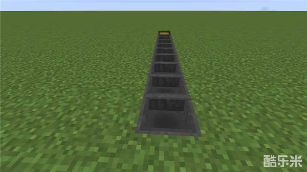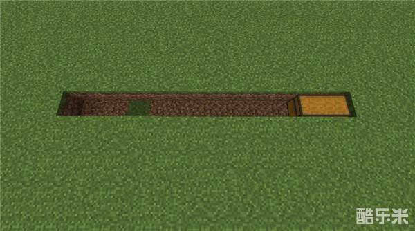 第一步:首先在地上挖一个长条形的坑并且在最右边放置箱子,这个坑的长度与熔炉的数量有关,取决于你烧炼东西的数量,一般来说6-12个就够用了,最右边的箱子是用来储存产物的。