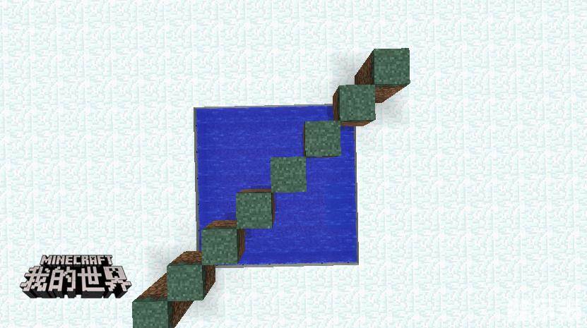 第二步:如图所示,在坑的对角线上方放上一排方块以遮挡天空,因为冰的生成条件是上方没有方块遮挡,所以放上这排方块的目的是保留一部分水源,避免坑里的水都结成冰,采集完也就没有水源了。