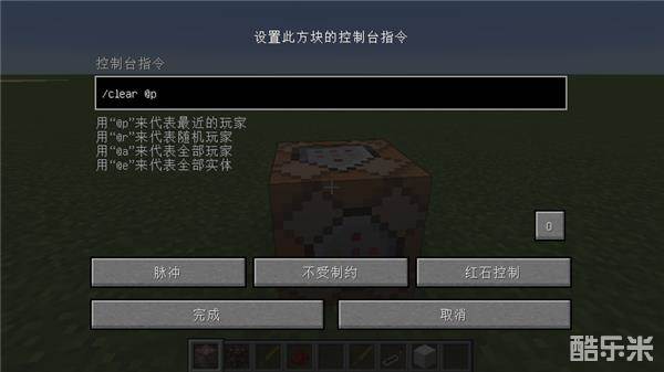 1.下图是清空命令方块的设置,指令为/clear @p