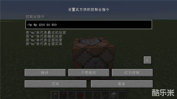 2.下图是传送命令方块的设置,传送点就是角斗场的出发点,如果组队PVP的话,可以在两个过滤室设置不同的传送点。传送的指令是:/tp @p <x> <y> <z>