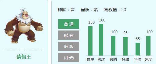 很多人都玩请假王,尤其是40级之后的平民玩家,对于它的成长属性也是很着迷的!但是很多人都玩儿不好请假王,感觉速度太慢,有时候打敌人1下就会被打4下,培养低一点的就死了!怎么让请假王成为站台的强力精灵呢,下面给新手们介绍一下。9 z- Q2 I. }) H4 _
