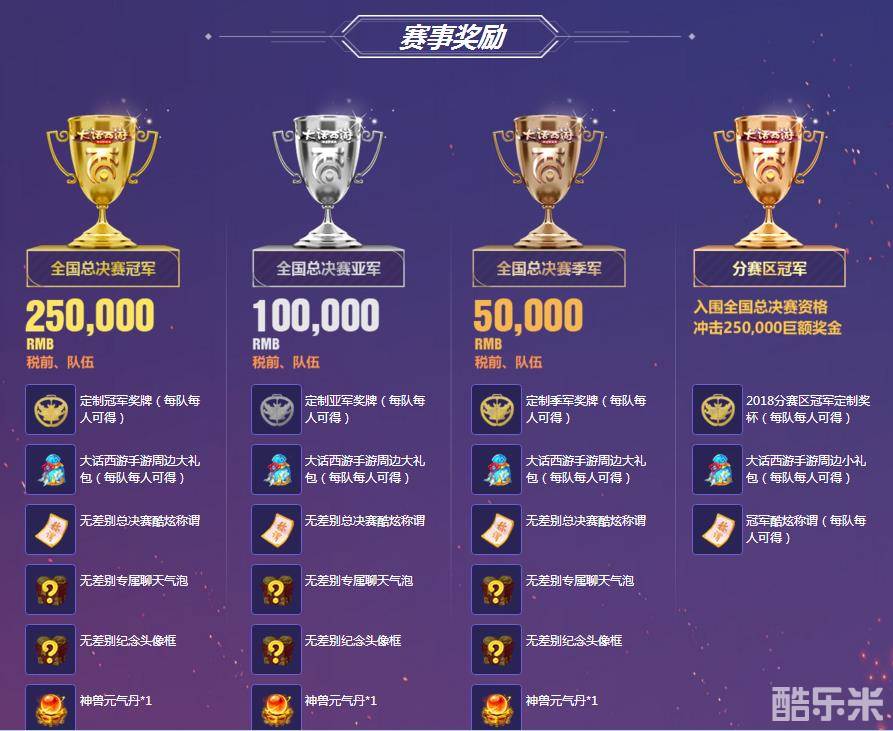 最终,通过实力技压群雄,创造大话手游PK传奇的冠军队伍,除了能独揽二十五万巨额现金大奖与专属定制冠军奖牌之外,还将赢取无差别总决赛酷炫称谓、精美周边礼包、专属聊天气泡、神兽元气丹等专属福利,而亚军与季军也将分别获得十万元与五万元的现金奖励,以及各种豪华道具奖励。战事欲起,各位少侠快报名参加吧!