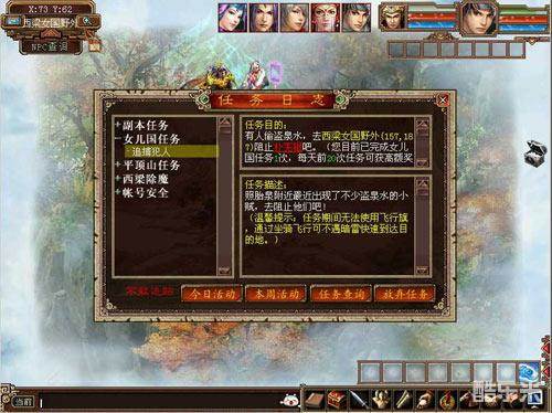 等级都达到飞升140级,具有坐骑飞行资格的玩家五人组队,就可以领取女儿国任务,分为营救使节、追捕犯人、破阵显威和女娲祭祀四种任务。每人每天的前20次任务可以获得奖励。