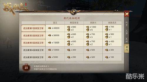 在争霸赛中,统治度排名第一的国王帮国王可获得高达40000元宝、10000开国封赏的超高奖励!同时,其家族族长、家族官员、家族成员也将获得不同程度的元宝、周易奖励!