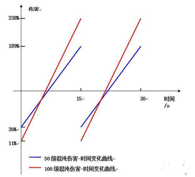 混沌100级:造成的伤害随时间匀速波动,最低为11%,最高为238%,周期15秒;