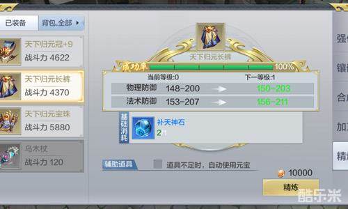 在玩家等级达到90级以后正式开放装备精炼,目前暂时只支持7档装备参与装备精炼。装备精炼为概率性成功,精炼成功后可大幅提升装备基础属性,且每次精炼需消耗道具——补天神石。而在精炼等级为+8及以上等级可使用辅助道具(云中月)使精炼失败时,精炼等级不降级。当全身12件装备达到指定精炼等级可激活精炼套装属性。