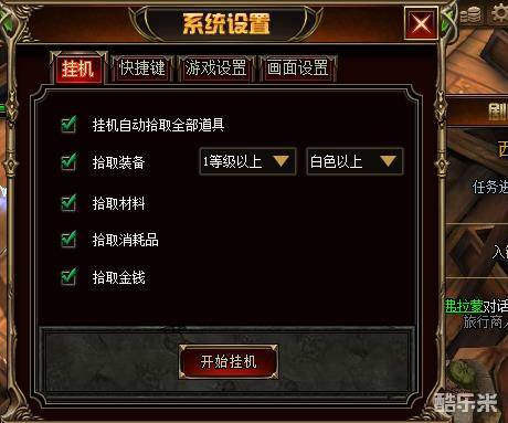 6、齿轮形状的按钮为系统设计按钮,可以自由修改挂机、快捷键以及画面质量等。