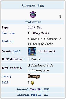 闪烁灯芯是光源类宠物,需要使用物品飞眼怪蛋召唤,它可以在黑暗中提供光源,并且拥有跟玩家相同的移动速度,不容易被甩下。