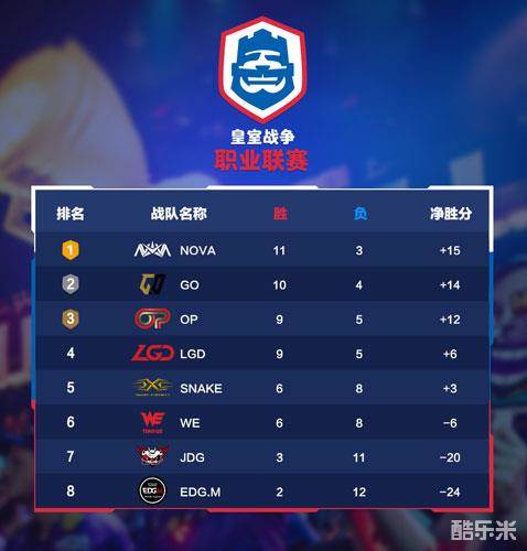 经过9周的14轮鏖战,CRL春季赛决出了最后晋级季后赛的4支队伍——皇室霸主NOVA,阵容豪华的GO,主场作战的OP以及老牌豪门LGD脱颖而出。而SNAKE、WE、JDG和EDG则遗憾出局,等待秋季赛卷土重来。8大战队的最终排名,也基本符合赛季初的预判。游戏熟悉程度、资金投入、圈内资源成为左右各大战队成绩的重要砝码。