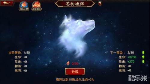 玩家在达到80级的时候,可以开启魂阵。培养魂阵可以提升武将属性。魂阵系统有多个魂阵,需要顺序激活,激活条件是前置魂阵达到指定等级。功能开启后自动激活第一个苍狗魂阵。