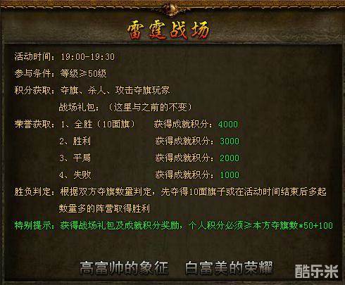 1、进入场景有,所有的玩家会被分为2队,进行夺旗角逐和PK,玩家可以去战场中央夺取旗子,交旗成功后,玩家可以获得500积分,本方阵营所有玩家的积分增加50;