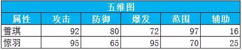 从五维图我们能够看出,惊羽攻击成长略微比雪琪高一些,爆发比雪琪高的多,但是在范围和防御方面比雪琪要稍微差一些。