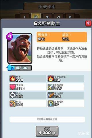 野猪骑士,7级血量1400左右,秒伤176,属性中等,但是专攻建筑,一般可以敲1~2下,费用上属于中等(4费),搭配小费有较强的突击性,也是对手必须要管的卡之一。