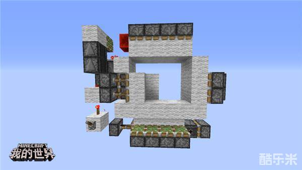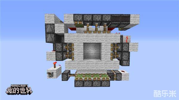 在本教程中,将会学习到图中所示的4×4漏斗形活塞门的做法。这种门又称漏斗门,因为关门时看起来似漏斗形状而得名。同时,在本教程中还会了解到如何灵活运用侦测器、活塞瞬推的特性,以及一些比较优秀的布线方案,例如在处理底部一排的活塞时,采用推动一条侦测器链来激活一整排活塞,达到减小体积的效果。机械体积为2×8×10=160 Blocks,为目前该结构下的最小体积。