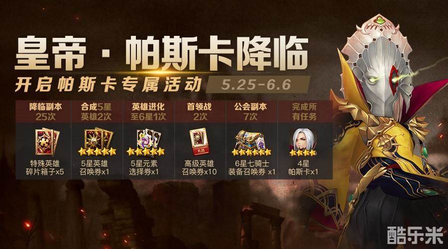 为了各位玩家可以更好的体验新降临的特殊英雄帕斯卡,5月25日-6月6日期间登陆游戏,参与降临·帕斯卡专属任务就有机会获得4星帕斯卡