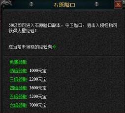 守卫七杀隘口,获取大量经验,玩家可以根据自己的需要来选择多倍领取经验。而石原隘口副本每天都有3次机会,玩家需要好好把握这副本来获取大量经验。