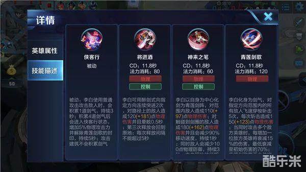 被动技能——侠客行:被动技能加让李白可以通过普攻积累剑气进入侠客行状态,增加自身的物理输出,并解锁大招。在实战中李白可以利用小兵和野怪垫刀,进入侠客行状态后再入场输出。