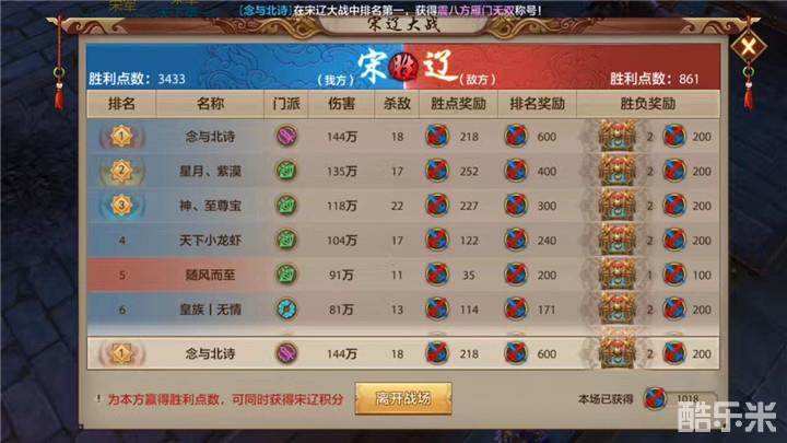 现版本宋辽大战活动的奖励是宝箱+宋辽积分,宝箱奖励很简单,胜利的一方所有少侠获得一个金宝箱,失败的一方所有少侠获得一个银宝箱,所以说胜利比争排名重要的多。在占据目标点的过程中,少侠们会持续获得胜利宋辽积分,战斗结束后根据伤害排名会依次发放相应的宋辽积分,而获胜的阵营会有额外的100点,每次宋辽大战的第一名会获得“震八荒雁门无双的”的称号,其余少侠也可以使用宋辽积分兑换称号,有的称号会有战斗力加成哦。