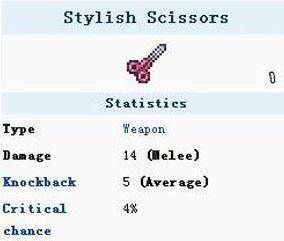 泰拉瑞亚时尚剪刀尽管它的速度很快,它不能自动摆动。它是造型师用来攻击敌方生物的同一种武器。获得方法向下看,有点奇特。前期获得的话还是不错的武器。