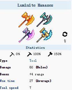 泰拉瑞亚是游戏后期的毕业工具,在打败月球领主之后才能获取,总的有四把:日曜锤斧、漩涡锤斧、星云锤斧和星尘锤斧,四把的属性都是一样的。夜明锤斧是游戏中第二强的锤斧,仅次于电音吉他,不过使用范围优于电音吉他。