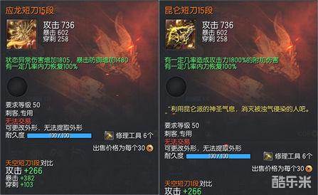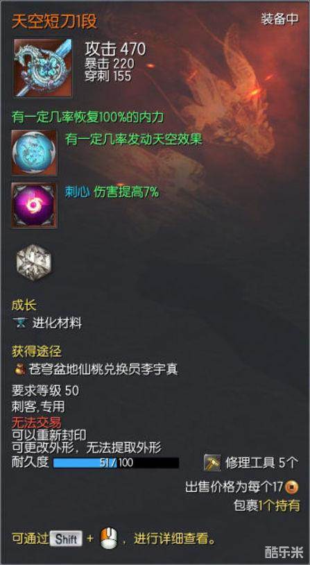 其中武器本身决定的是470攻击力,220暴击,155穿刺,和“有一定几率恢复100%的内力”;“天空元气石1段”决定的是“有一定几率发动天空效果”;“命运真气石1段决定的是“刺心伤害提高7%”,这三部分都可以独立成长,各部分所消耗的物资大约分别是之前一把完整的天空短刀的1/3。