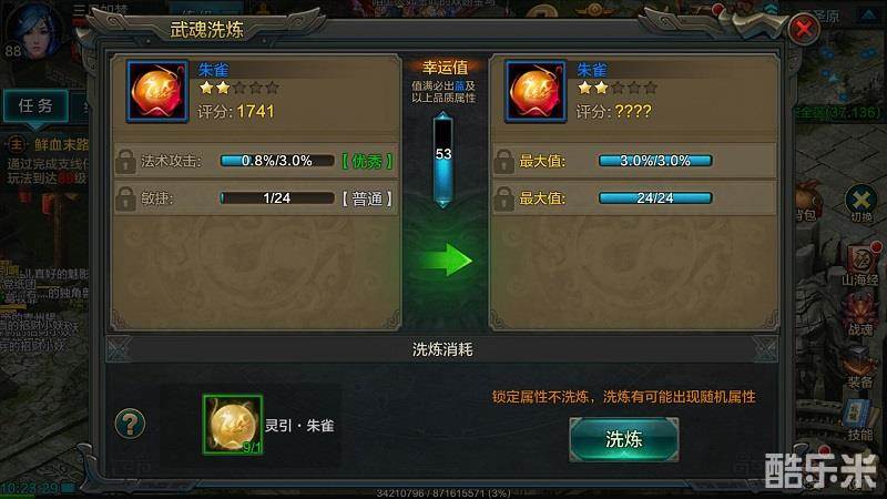 武魂每次进化时会随机增加一条附加属性,附加属性分为普通、优秀、杰出、卓越、完美、史诗六个等级,如果对附加属性不满意可通过灵引进行洗炼。需要值得注意的是,每次洗炼是随机变更武魂上的所有属性。如果洗炼到满意的属性后,下次洗炼时可以将满意的属性锁定,每增加一条锁定属性,所需要的灵引是成倍增加的。当然,也可以将武魂升到五星时,再慢慢洗炼属性,这样一个灵引就能随机产生5条属性,综合算下来,这样可以用最少的灵引洗炼最多的属性。