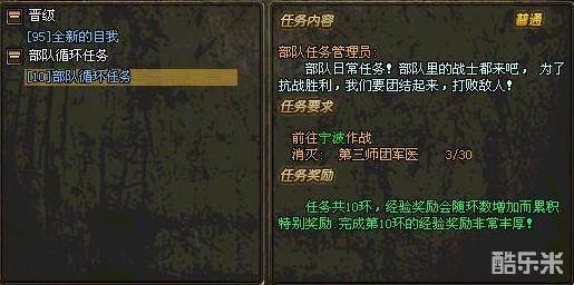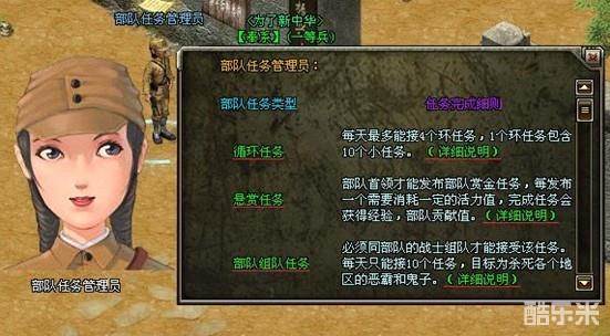 在北平部队指导员陈玉桃处,可以点击进入部队基地,找到部队任务管理员,就可以接受部队循环任务。
