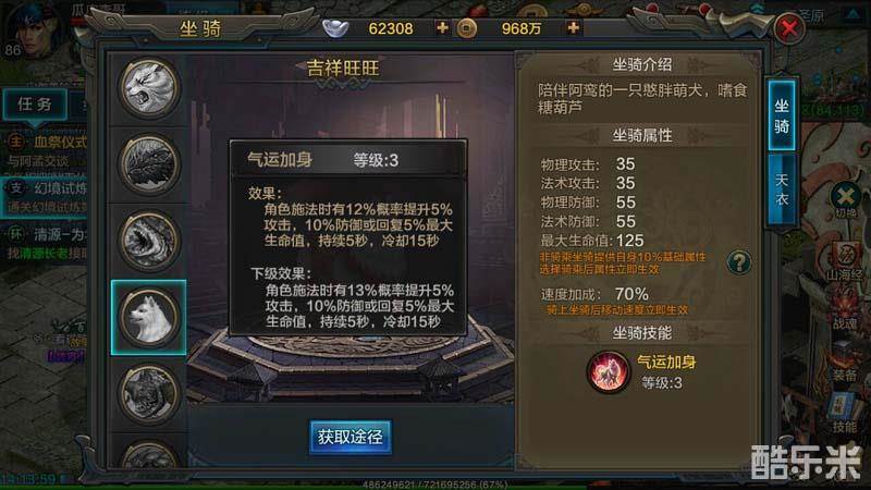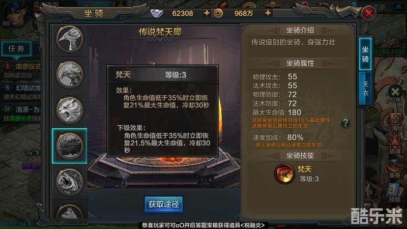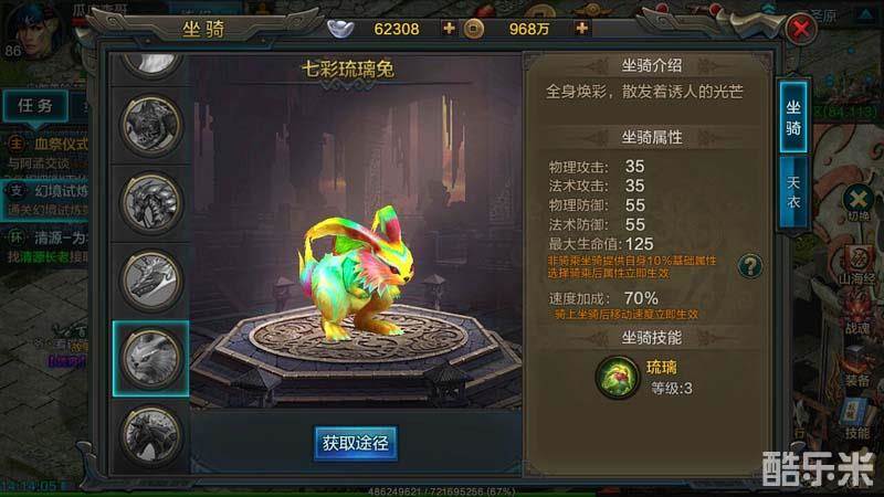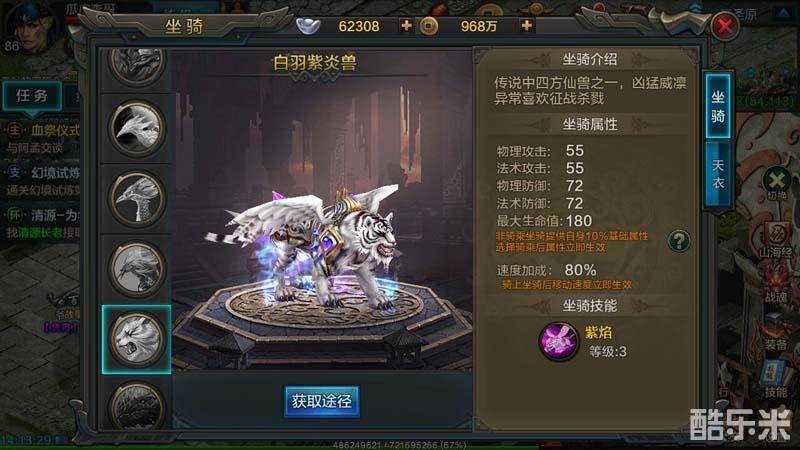 总结:在这么多坐骑中,坐骑的技能基本上全职业都适合=用,我们可以根据不同的战斗情况来使用不同的坐骑。比如在九黎中需要打出更高的输出,我们可以使用索命蝎皇、七彩琉璃兔、海煞等坐骑来增加输出,而在伤亡几率较大的战场和世界首领活动中,可以选择传说焚天犀、金甲黄金战熊、烈焰凤凰来增强生存能力。