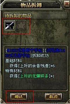 1)拆分装备是把手头用不上的装备拆解成材料,供改良或升级有用的装备。把装备放入上面待拆解的孔中,点击下面确认按钮,就完成了装备的拆解。