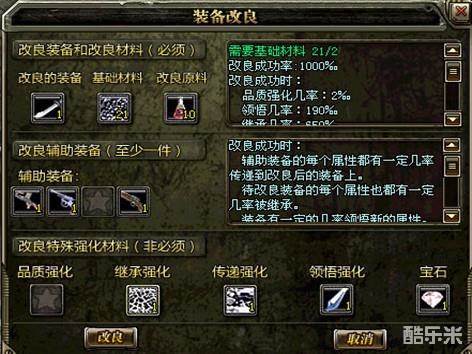 3)改良装备可以将装备不需要的属性去除,以获得需要的属性。放入需要改良的装备,然后放入基础材料和常山油剂,至少放入一件辅助装备,然后放入成功石和各种强化石。