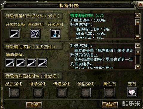 4)升级装备是把低等级装备升级成高等级装备。放入需要升级的装备、基础材料(根据装备等级放入不同等级的残渣)、升级材料、与升级装备相同的四件装备(不论品质);由于升级装备有一定几率失败,还可以放入宝石以提高成功率(如果不想冒太大的风险,放入粉钻就可以获得100%基础成功率哦)。