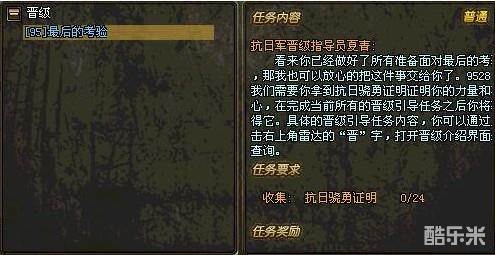 从25级到85级,所有晋级任务奖励的《抗日骁勇证明》刚好24个,如果前面的任务都做了,那么就可以直接完成《最后的考验》,如果还没有做,就赶快去做吧。