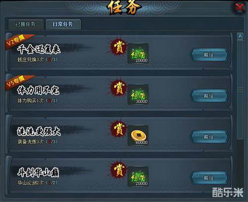 当你觉得自己没什么地方可以获得经验的时候,日常任务可以为你提供一定的经验,钱庄兑换、体力购买、装备洗练、华山论剑、傀儡道场、五行晶宫、悬赏辑贼、试炼之塔等等玩法都能让你获得经验,只不过不是很多而已,但是蚊子再小也是肉啊,多得一点是一点。