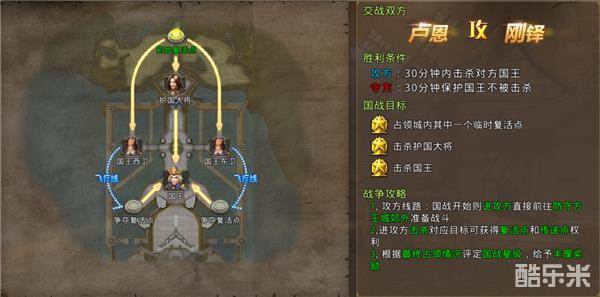 国战的时间为30分钟,进攻方击杀防守方主城内的系统国王为胜利,防守方坚持30分钟,保证己方系统国王存活为胜利。