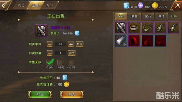 点击出售选项,玩家可以在右侧栏中选择想要出售的物品,拍卖的价格只能设定在系统给出的参考价之间,玩家可以选择想要寄售的天数,达到寄售时间仍未寄售出去则会通过邮件返还。拍卖物品系统会收取100金币的拍卖管理费。